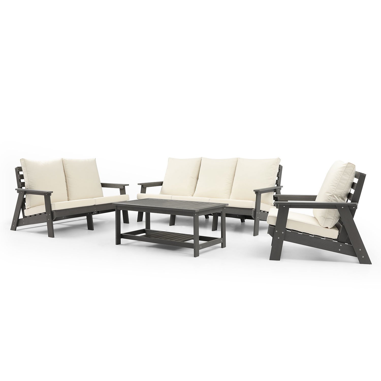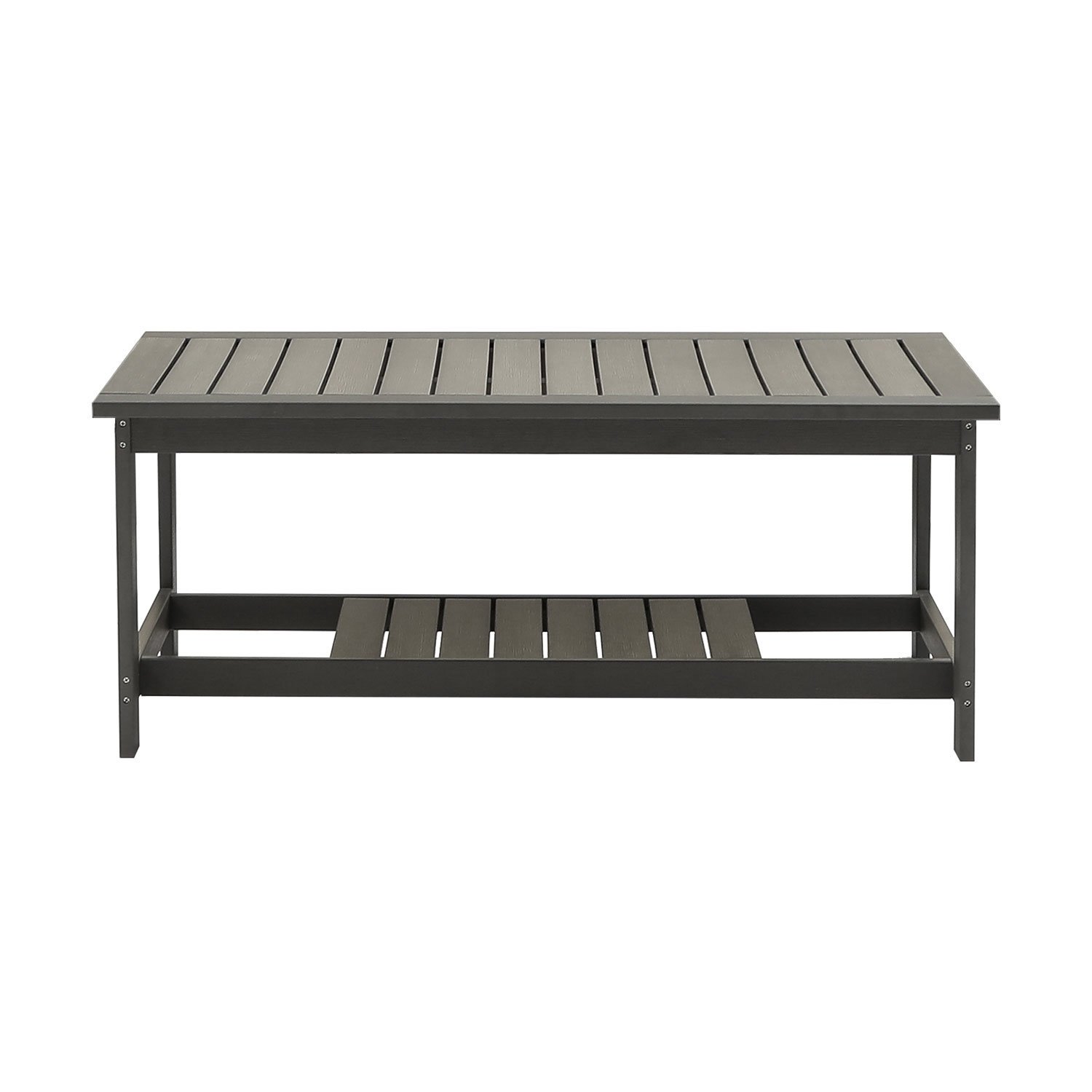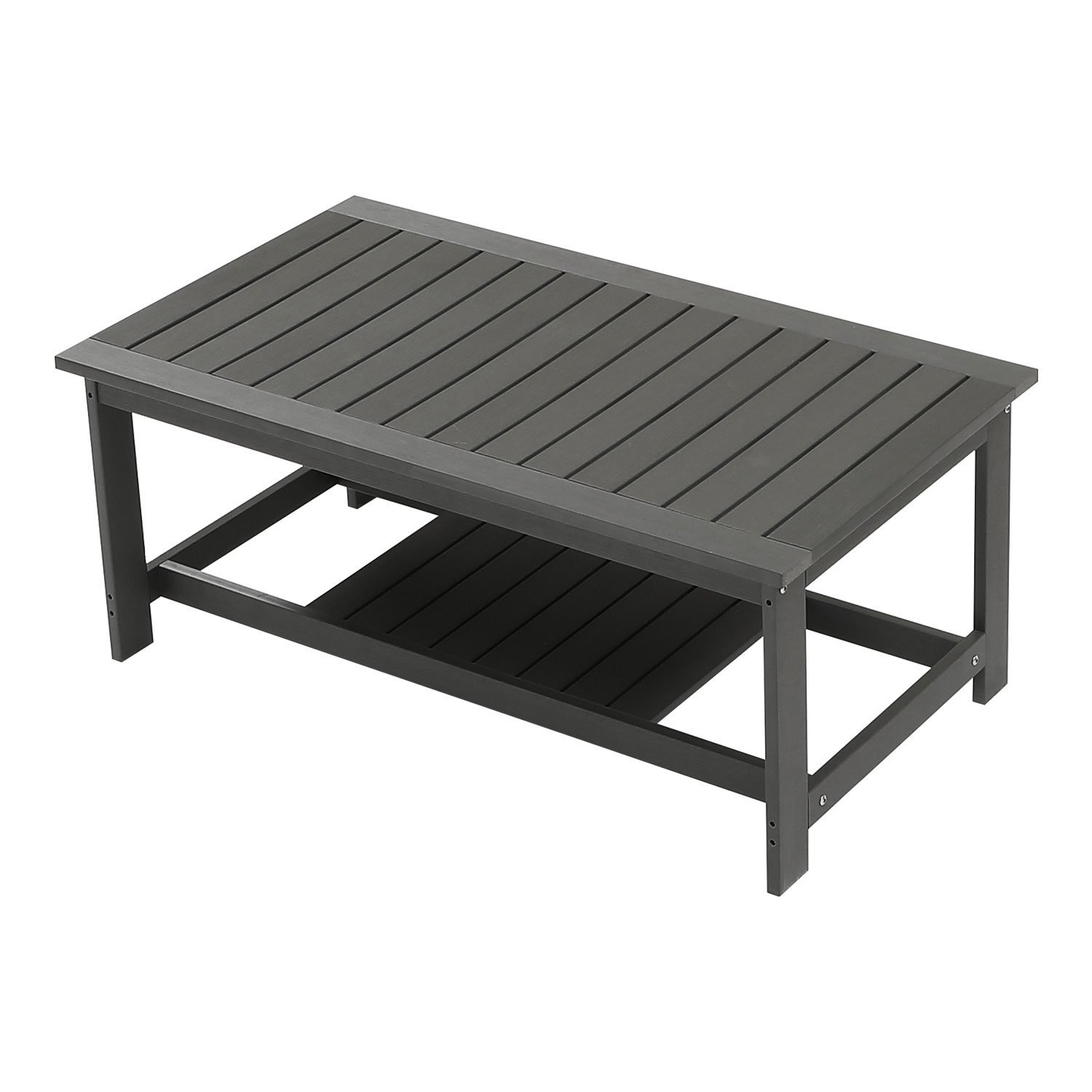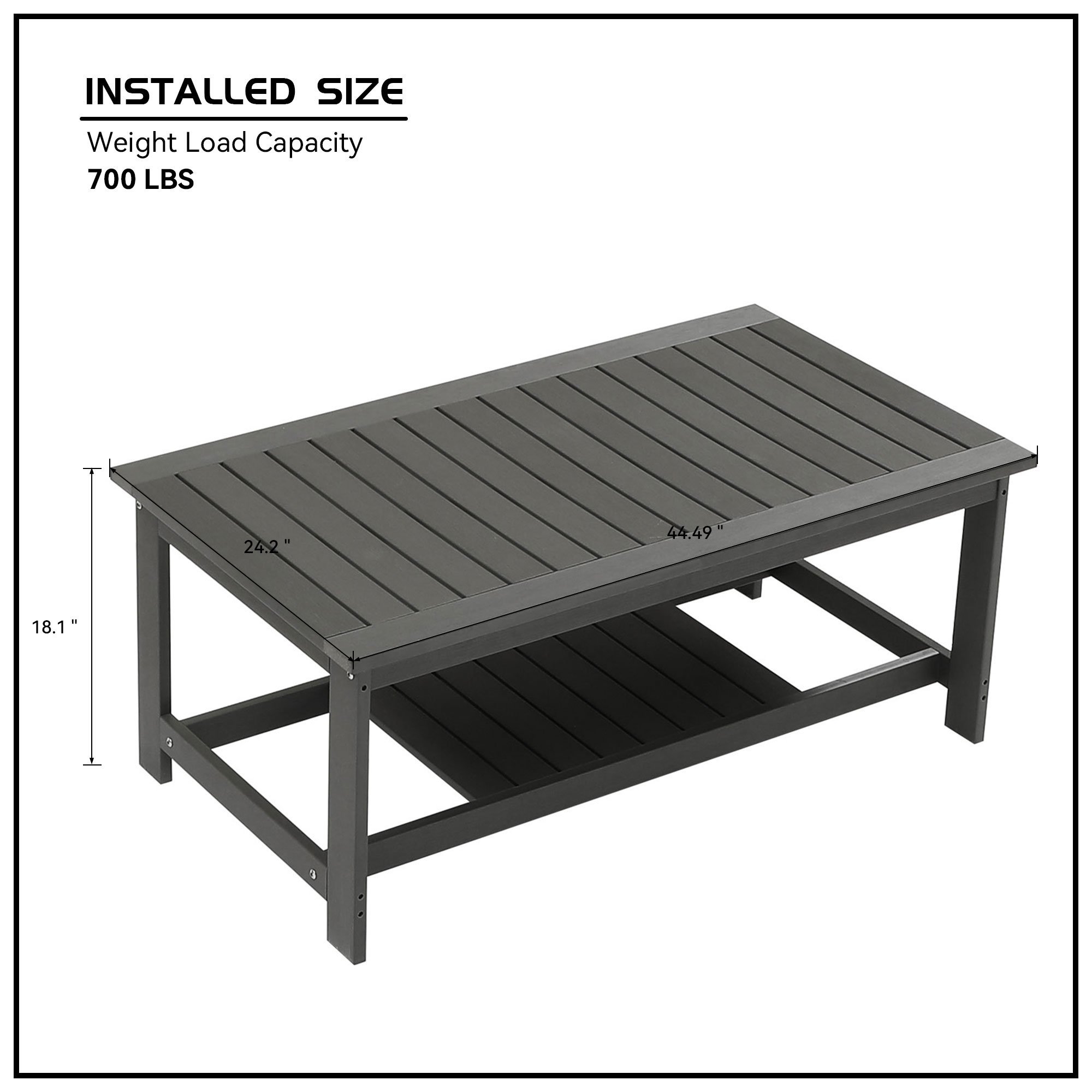 Perfect size for patio setThis HIPS outdoor coffee table is free of burrs to prevent stabbing of the skin. The exquisite connection between panels is firmly fixed by the screws to ensure that it wont easily wobble or fall apart. Outdoor coffee table is the perfect companion for sofa, adirondack chair, chaise lounge and rocking chair.This outdoor side table for patio is made of tech HIPS, is all weather resistant than poly lumber table. The end table is long lasting in the sun and rain, is fade resistant, rustproof and never peel.Side table make a big optimized design with storage tier, perfect to put your books, drink, flowers deco on, free your hands and save more space to enjoy your time.